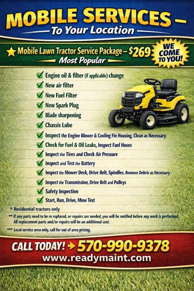 No more dragging your machine to a repair shop. No more waiting for the shop to pick up, service, and deliver your equipment. I offer a comprehensive preventive maintenance package that will have your lawn tractor freshly serviced and ready for the season!